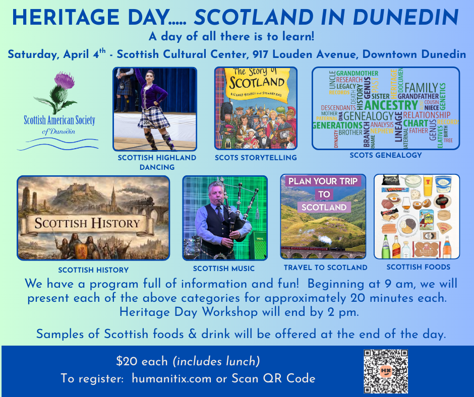 Join us for a day of learning all about Scotland in Dunedin, Florida! Take this journey with us on a trip about the various aspects of Scotland. We will show you Music, Dance, History, Storytelling, Foods, Genealogy and Travel! The day includes a lunch, samples of Scottish foods, and will end by 2 pm.
