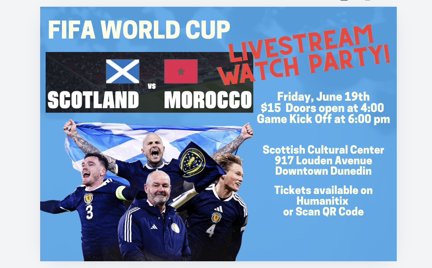 Join us as we livestream the FIFA World Cup 2026 match between Scotland and Morocco! We are hosting the game on our 86″ TV in the Scottish Cultural Center. For $15, you will get a reserved seat and a Scotch Meat Pie and Beer of your choice!